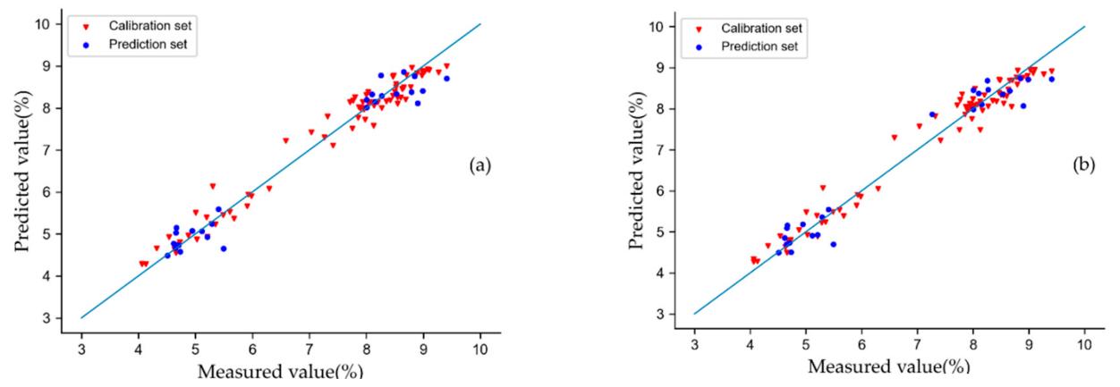 图2 不同输入下GBR模型的预测结果。基于KS划分数据集的建模结果(a)、基于SPXY划分数据集的建模结果(b)。
