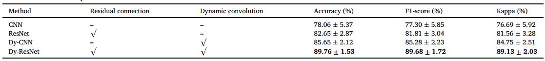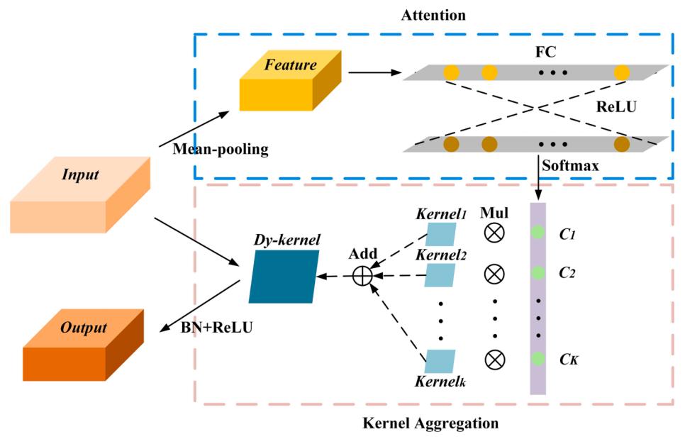 与传统机器学习相比,深度学习具有端到端特征,避免了复杂的特征工程。代表性的模型是卷积神经网络(Convolutional neural networks, CNN)和残差网络(Residual networks, ResNet)。利用ResNet中提出的残差连接直接连接不同的网络层,在保证良好网络性能的同时可以加深网络。然而,当CNN或ResNet的深度和宽度固定时,由于卷积核不容易根据实际数据的特点进行有效调整,其表示能力将受到限制。动态卷积是在静态卷积的基础上改进的非线性运算。它可以解决深度学习模型适应性差的问题,更有效地提取数据特征。同时,动态卷积计算是高效的,因为并行卷积核通过聚合共享输出通道,这不会增加网络的深度和宽度。在网络中引入动态卷积可以在特征识别过程中自适应捕获特征。