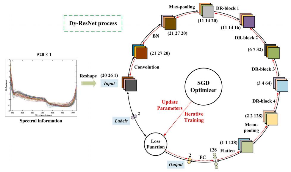 (2)提出了一种基于动态残差网络(Dy-ResNet)的高光谱数据挖掘模型。在模型优化过程中引入残差模块,避免梯度消失;引入动态卷积层,提高模型的自适应性和表示能力。