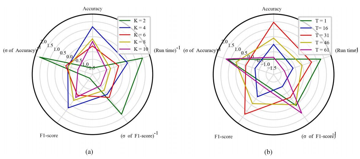 在动态卷积层中,参数K和T显著影响稳定性和精度。如果K过大,虽然模型具有更强的表达能力,但优化所有卷积核和注意力更加困难,网络更容易出现过拟合。在softmax层中,T控制了注意力权值的稀疏性,适当的T可以使模型在早期训练中更有效。因此,有必要确定K和T的最优值。如图5所示,当K较小时,模型的训练时间和分类稳定性都较好。然而,K的数量限制了动态卷积核的自适应能力,降低了模型的分类精度和F1-score。当K设置为4时,既保证了模型的分类性能,又充分考虑了训练时间。T越大,模型的稳定性越高。但是,当T过于大时,模型的分类性能会下降,因此将T设为31。