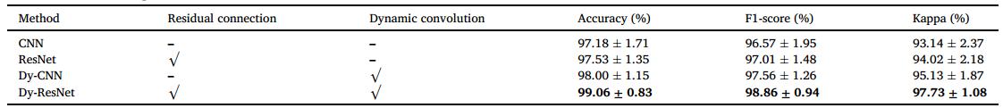 为了进一步验证Dy-ResNet在塑料识别中的有效性,分别使用Dy-ResNet、ResNet、Dy-CNN和CNN模型对17种样品进行分类。4个模型在全连接层的输出神经元数量从2个变为17个,4个模型的其他结构和超参数不变。17种塑料的分类结果见表2。总体而言,DyResNet的分类性能优于其他模型,其准确率为89.76%,F1-score为89.68%,Kappa为89.13%。与CNN相比,Dy-ResNet中的残差连接可以有效提取塑料高光谱图像的深层特征。在5个独立实验中,Dy-ResNet的模型精度最高,表明其具有*好的识别稳定性。残差连接和动态卷积层的引入可以有效地提高模型的稳定性。