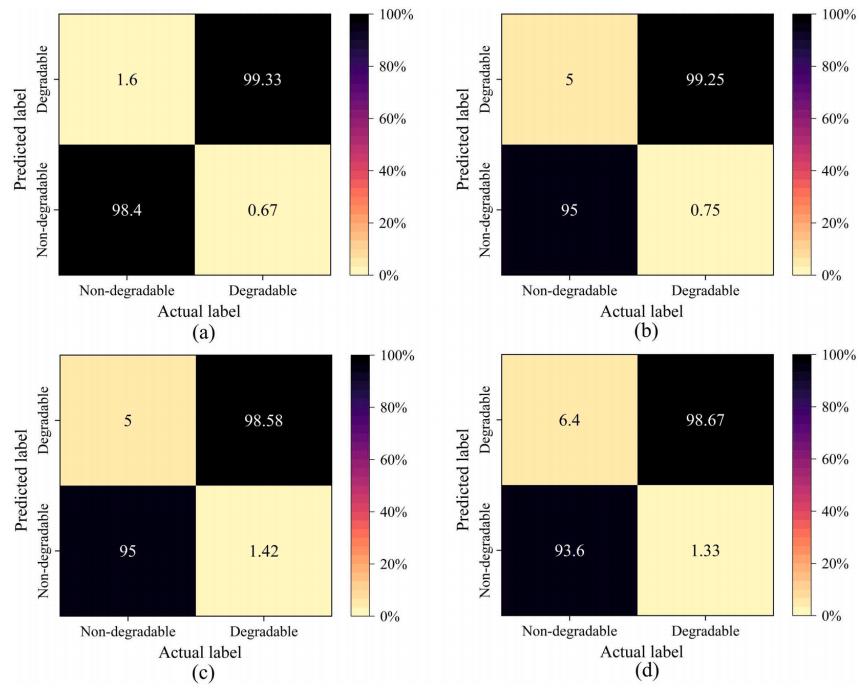 图6 四种方法对可降解塑料和不可降解塑料的分类结果。Dy-ResNet(a), Dy-CNN(b), ResNet(c), CNN(d)