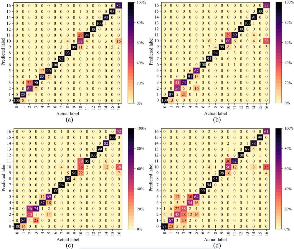 图7 四种方法对17种塑料的分类结果。Dy-ResNet(a), Dy-CNN(b), ResNet(c), CNN(d)