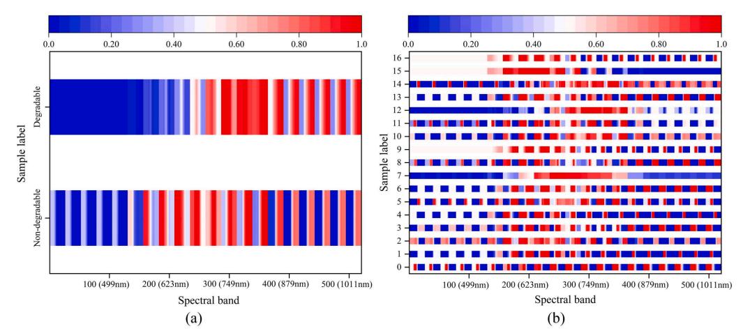 图8 用于塑料识别的特征光谱可视化。2分类实验(a), 17分类实验(b)