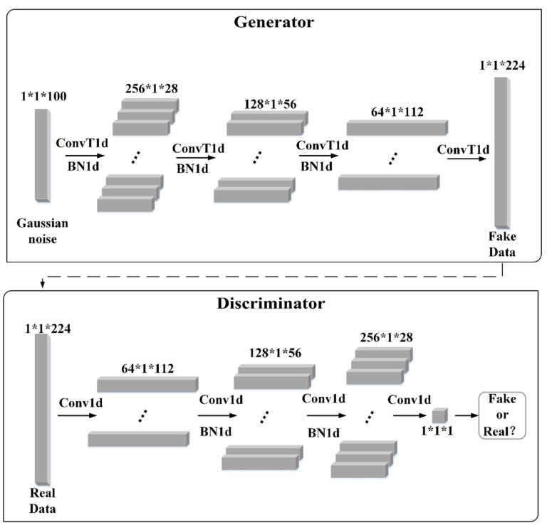 GAN是由生成器(Generator)和判别器(Discriminator)两个部分组成(图2)。生成器接收随机噪声,通过生成模型生成假样本。判别器的输入是一个样本,判别网络判断输入样本是来自于真实样本还是生成器生成的假样本。通过不断训练,生成器最终生成尽可能真实的数据。本研究采用DCGAN作为增强数据的方法。DCGAN主要的改进是在网络结构上,生成器和判别器中均使用了一个卷积神经网络,同时改进了卷积神经网络部分结构(图3)。