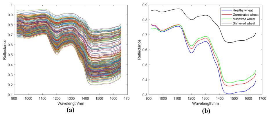 图4 籽粒光谱。所有小麦籽粒的光谱(a);小麦籽粒在四种不同状态下的平均光谱(b)。