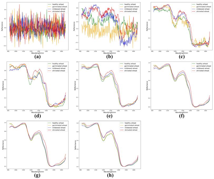从图4可以看出,4种小麦籽粒的光谱特征相似,萎蔫籽粒的平均光谱反射率显著高于其他3种,健康籽粒的光谱反射率值差异*大。霉变小麦籽粒受到真菌侵染的影响,籽粒表面颜色和形状发生变化,但对含水率影响不大。因此,与萎蔫小麦籽粒相比,其光谱反射率值接近健康籽粒。萌发籽粒与健康籽粒不同,因为其萌发需要消耗能量。但与其他两种籽粒相比,其光谱反射率值最接近健康小麦籽粒。在1150 ~ 1300 nm和1400 ~ 1650 nm两处波段的差异为后续分类算法的建立提供了基础。