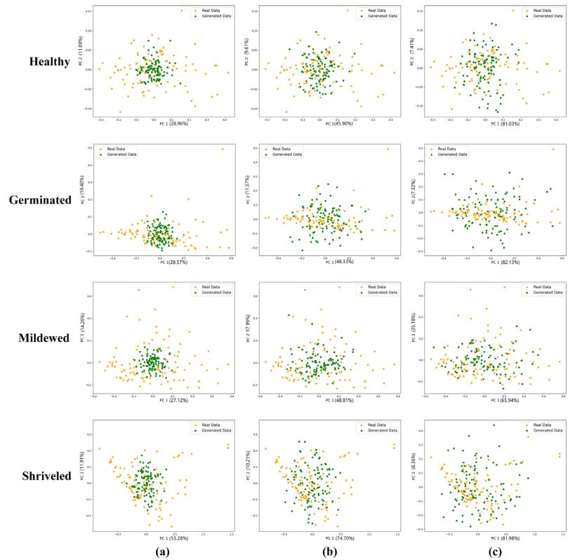图6 500、1500、2000次epoch下生成的光谱数据的主成分降维图
