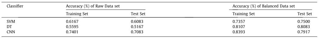 表4给出了分类器在原始数据集和平衡数据集上的对比实验结果。数据平衡后,所有分类器的测试集的准确率都得到了提高。其中,准确率提高幅度最小的分类器是CNN模型,准确率提高了8.34%。提升*大的是DT模型。准确率从51.67%提高到80.83%,这也表明分类器受样本是否平衡的影响明显。从图7可以看出,数据扩展后,每个类别的误分类次数都在减少。虽然这三种分类器从增加的数据样本中学习到了更多的特征,准确率也有了很大的提高,但最终测试集的准确率仍然不能令人满意。此外,CNN模型还存在过拟合的风险,其训练集准确率与测试集准确率相差超过3%。这可能是由于训练样本较少,CNN模型无法学习到更深层的特征,导致过拟合。因此,需要更多的样本来提高分类器的识别能力。