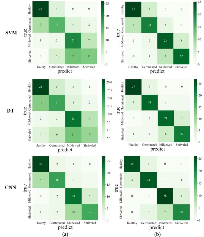 图7 三种分类器在不平衡数据集(a)和平衡数据集(b)上分类结果的混淆矩阵
