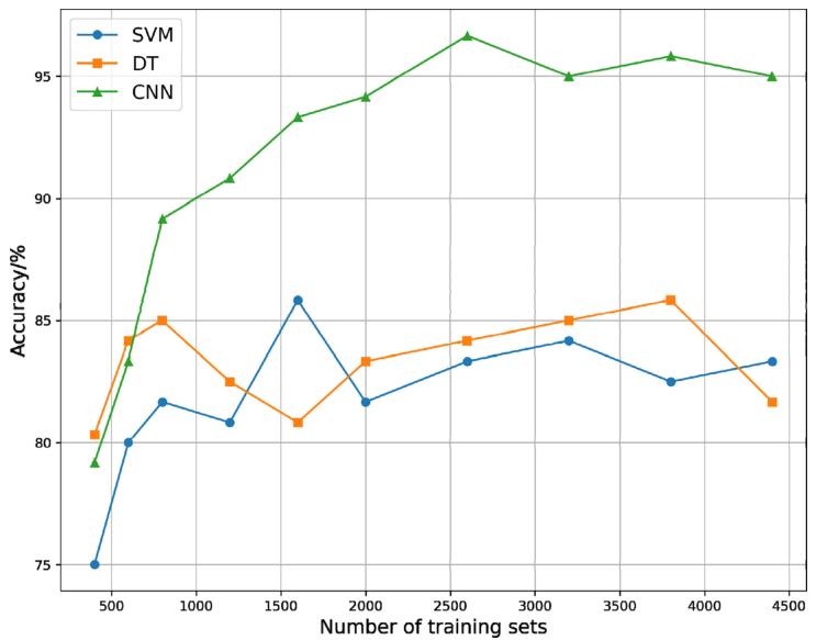 从表3和图8可以看出,随着加入训练集样本数量的不断增加,SVM、DT、CNN模型的性能变化是不同的。在每种小麦籽粒的训练集数据中加入50个样本,SVM模型的测试集准确率从75%提高到80%。然后,当训练样本数量增加200个时,SVM模型的分类准确率最高,达到85.83%。随着样品的不断加入,其准确度在80% - 85%之间波动。这表明SVM仍然从这些增量样本中学习到一些特征,但学习到的特征相对有限。DT模型的准确率虽然也有所提高,但提高幅度较小,其准确率一直在80%到85%之间波动。这表明DT模型从生成样本中获得的收益很小。对于CNN模型,随着样本数量的增加,其准确率从79.17%提高到96.67%,总计提高了17.50%。之后,它的测试集准确率开始在95%左右振荡,并没有随着训练样本的增加而增加。这可能是由于DCGAN在生成样本时,作为其近似目标的真实样本数量相对较少。因此,虽然选择了相似性和多样性*好的生成样本,但与现实世界中的真实样本相比,其多样性仍然比较一般。然而,与SVM和DT两种机器学习模型相比,CNN具有更强的数据拟合能力和分类能力。随着样本数量的增加,它可以学习到更多的特征。