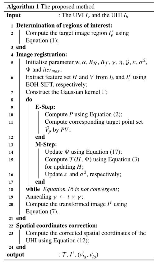 其次,在获取参考值后,利用UVR对UHI进行图像配准。图像配准的目的是对高光谱影像进行变换,使其与目标影像UVR对齐。将UHI在更精确的地理坐标上对齐,以实现树种的定位。主要分为以下三步:(1)特征点提取。在基于特征的方法中,特征提取是点集配准的关键。本研究采用基于SIFT-like scale space(EOH-SIFT)的Edge Oriented Histogram descriptor(EOH)进行特征点集提取;(2)特征点集配准。采用期望*大化(Expectation maximization, EM)算法来完成图像配准过程,该过程在两步之间交替进行。EM算法的这两步分别对应于对应估计和变换更新;(3)图像变换。为了解决图像的几何畸变和非刚性畸变,我们利用薄板样条插值(Thin plate spline, TPS)来模拟更广泛的变换。