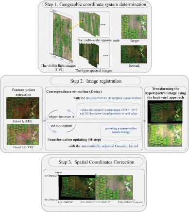 首先,利用高分辨率的UVI和地面控制点来拼接一个地理坐标系作为参考值,并根据拼接后的UVI中的高光谱图像选择合适的区域(UVR)。