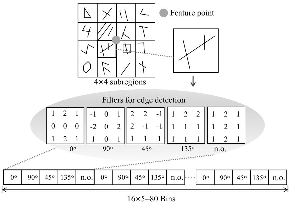 文中使用的EOH-SIFT算法是一种特征点描述符,用于在同一场景的RGB图像上匹配特征集。首先,通过类似SIFT的尺度空间表示法检测特征集,然后用EOH来表示这些特征集,得到80维的向量作为EOH-SIFT描述符,如图2所示。