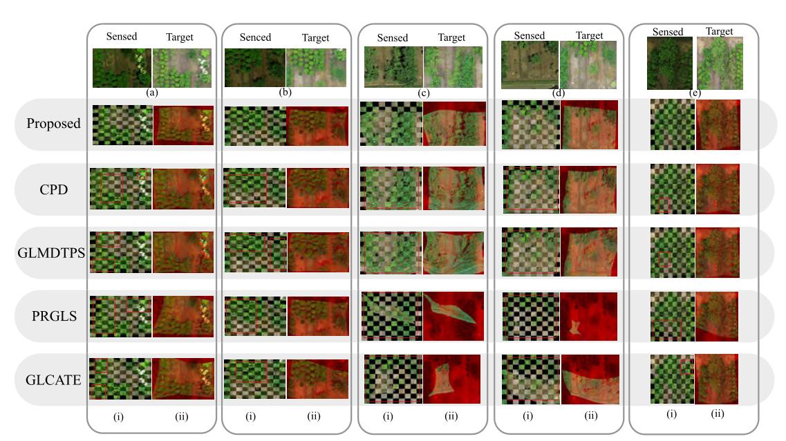 图3 不同配准方法示例。(i)为每个示例的10 × 10校准板,其中使用红色矩形突出显示配准错误;(ii)为重叠面积