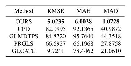 为了验证所提出的配准方法的优越性,将本研究的方法与相干点漂移(CPD)、用薄板样条变换的全局和局部混合距离(GLMDTPS)、全局-局部对应和变换估计(GLCATE)以及保存全局和局部结构(PRGLS)这四种方法进行比较。