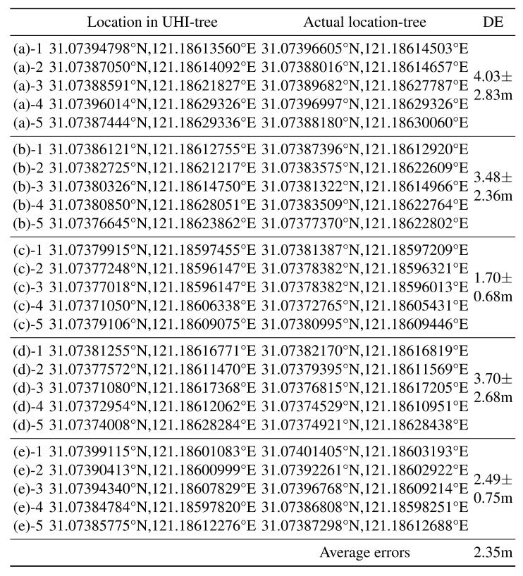 表3 单棵树在UHI中的坐标与实际坐标的比较结果。DE表示偏离误差