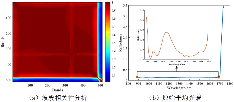 图1b(蓝色线条)为HSI捕获到的原始平均光谱曲线,可以明显看到在整个光谱区域没有特异的波峰波谷。为了找出峰谷突出的区域,分析了光谱波段之间的相关性。对于维度为(x, y, λ)的高光谱数据,转换为(z = x × y, λ),并对z进行相关性分析,结果如a所示。图中显示红色区域的波段在整个波段中占比94.34%,其余颜色区域总共占比5.66%。为了***限度地保留 “纯净数据”,防止其它颜色区域数据的干扰,通过查询颜色栏数据并结合波段得知红色与其余颜色区域的相关性分界点为0.8(波段:483)。随后,将相关性小于0.8的30个波段从数据分析中剔除,从而***了1685.47-1735.34 nm的光谱区域。得到的光谱曲线如图1b(红线)所示。该过程获得的光谱数据(150×483)用于后续的模型建立和分析。