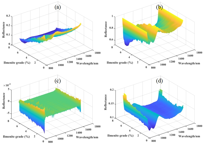 图2 HSI采集钛铁矿样品的三维光谱:(a) RAW光谱;(b) CR预处理后的光谱;(c) SD预处理后的光谱;(d) MSC + SG预处理后的光谱。