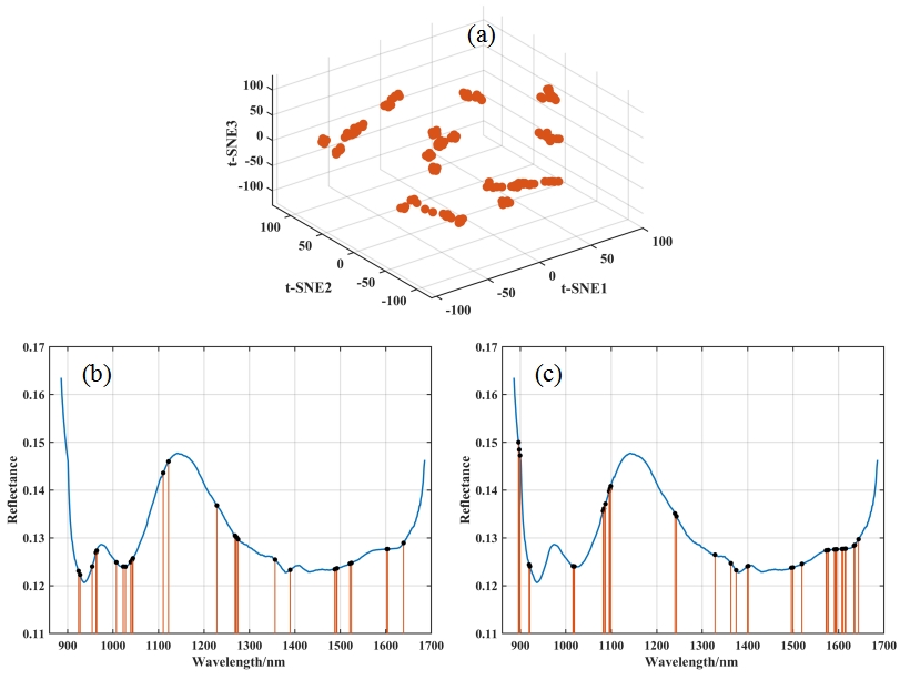 图3 不同降维方法下的数据分布:(a) t-SNE;(b) iPLS-VCPA-IRIV;(c) iPLS-VIP-IRIV。