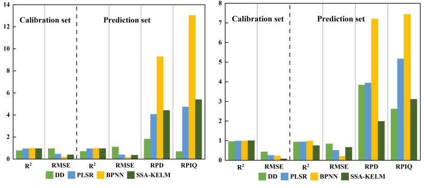 采用SG、MSC、CR、SD、MSC+SG等5种预处理方法对原始光谱数据进行处理。基于DD模型对比原始光谱数据,探索出HSI光谱数据的***预处理方法,结果如表2所示。预测集中,与原始数据相比,MSC+SG方法下的各指标R2P提高了5.88%,RMSEP降低了34.39%,RPD和RPIQ分别提高了28.86%和38.93%。