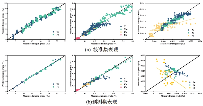 从iPLS-VCPA-IRIV特征选择的拟合光谱数据图(图6)可以看出,在校正集中,钛铁矿多组分品位都均匀准确地分布在理想曲线上。然而,对于预测集来说,明显可以看出来的是,除拟合良好的主要品位(Ti、Fe)和次要品位(V、Mn、Co、Cu)外,微量品位(Zn、Zr、Pb)的拟合似乎并不令人满意。因此,在下一步工作中,可以对少样本量下矿石内部微量品位的变化进行更深入的研究。