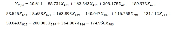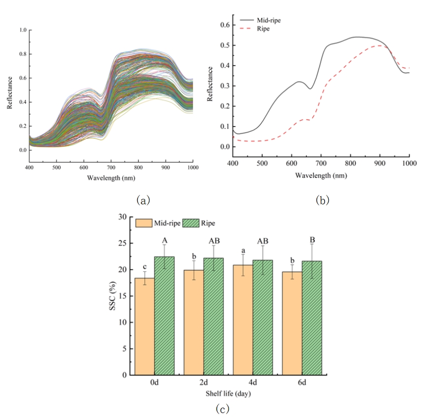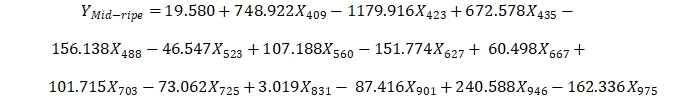 图 1a 显示了所有冬枣样品的平均光谱曲线,曲线趋势基本相同。图 1b 显示了陕西大荔冬枣在 400-1000 纳米范围内的平均光谱曲线。总体而言,中熟冬枣和成熟冬枣的光谱模式相同。与中熟果实相比,由于花青素和类胡萝卜素的吸收,成熟冬枣在 450-600 nm 范围内的反射率偏平,而花青素和类胡萝卜素是果实着色的原因。680 纳米波长处的差异是由于不同成熟阶段冬枣果皮中叶绿素含量不同造成的。840 nm 附近的反射率是由于冬枣中熟期和成熟期的 SSC 差异造成的。波长 970 纳米处的反射率下降较快,这与果实中的含水量有关。从光谱反射率可以看出,不同成熟度的冬枣在色素含量和理化性质方面存在明显差异。