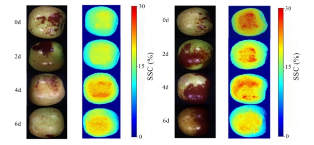 如图 4 所示,根据色标,颜色从蓝色到红色不等,SSC 值越高,红色越浓。总体而言,与中熟红枣相比,成熟红枣的预测 SSC 值更高,红色像素更多。从图 4a 中可以看出,在 0 d 时,中熟冬枣的预测图像在中心区域显示为浅黄色,SSC 值约为 20%,在边缘区域显示为青色,SSC 值约为 14%。随着保质期的延长,中心区域的黄色逐渐向边缘扩散。4 d 时,中心区域出现红色,此时 SSC 约为 25%,边缘区域的青色被黄色取代。6 d 时,中心区域的红色像素减少,表明 SSC 下降。在图 4b 中,0 d 成熟果实的中心区域为红色,此时 SSC 约为 28%,SSC 从内向外逐渐变小。2 d 和 4 d 时,中心区域仍以红色为主,没有太大变化。6 d 时,中心区域以黄色为主,表明 SSC 有所减少。SSC 的总体趋势与参考值的变化一致。绘图结果表明,在不同的货架期,每种水果的 SSC 都有显著的空间变化,这有助于通过可视化进行无损分级。
