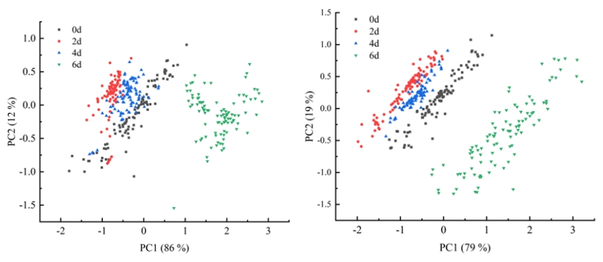 为了直观地显示和解释光谱数据以及任何可能的样本关系,对冬枣进行了主成分分析(PCA)。图 5a 是中熟冬枣在货架期的 PCA 散点图,从中可以看出,前两个主成分(PC)解释了 98 % 的信息(PC1=86 %,PC2=12 %)。据观察,随着保质期的延长,样品之间的分离更加明显。保存 0 天、2 天和 4 天的样品之间有一些重叠,但保存 6 天的冬枣则完全分开。图 5b 显示了成熟冬枣在保质期内的 PCA 散点图。前两个 PC 占变异的 98%,PC1 的最大变异率为 79%,其次是 PC2,解释了总变异率的 19%。冬枣样品之间在保质期内存在明显的聚类现象,只有存放 2 d 和 4 d 的样品之间有少量重叠。因此,有必要建立一个有监督的模型来分析保质期。
