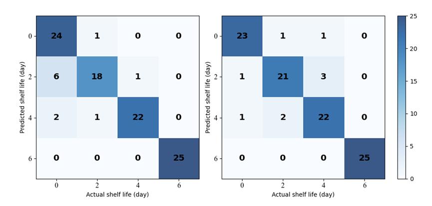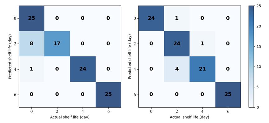 为了准确确定保质期,根据 SPA 选择的有效波长建立了 LIBSVM 分类模型。图 6 显示了确定保质期模型的交叉验证结果。8 个保存 2 d 的中熟样品被误判为保存 0 d,1 个保存 4 d 的中熟样品被误判为保存 0 d。至于成熟冬枣,共有 6 个样本被错误识别,其中大部分发生在保质期的 2 至 4 d 之间,总准确率为 94%。此外,LIBSVM 模型在外部验证集上也取得了良好的货架期分析性能(图 7),对中熟和成熟样品的准确率分别为 89 % 和 91 %。总之,LIBSVM 模型在确定冬枣保质期方面的表现令人满意。