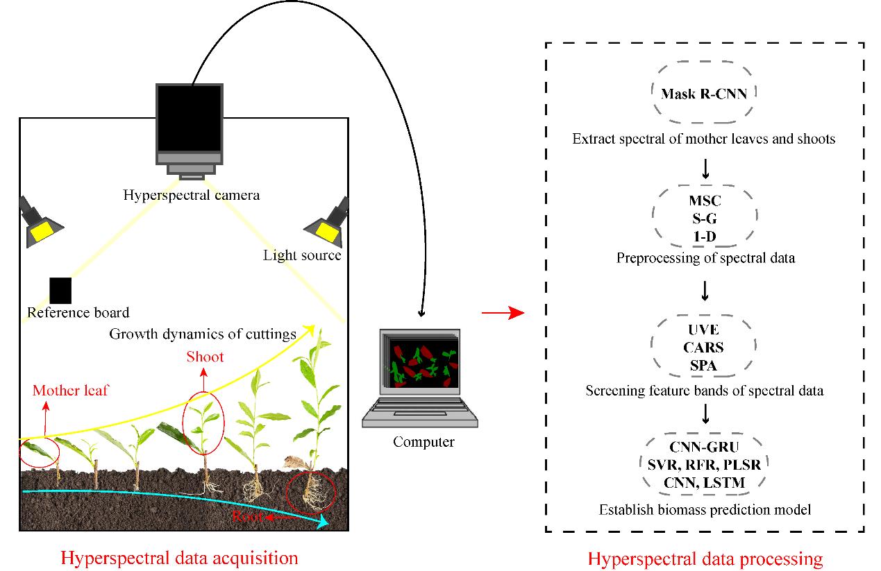 实验设计:利用高光谱成像设备(Gaia field Pro-V10, Dualix Spectral Imaging)采集整个育苗时期的茶树扦插苗的光谱数据。采集系统的外部由一个黑色的暗箱封闭。此外,高光谱相机捕获的图像的光谱范围在可见-近红外波段(391-1010 nm)有1101 ×960像素,可以测量360波段的光谱反射率。为了减轻扦插苗生长后期叶片重叠的影响,对扦插苗的冠层进行了检查,将被遮挡的成熟叶片和嫩枝移至视场。