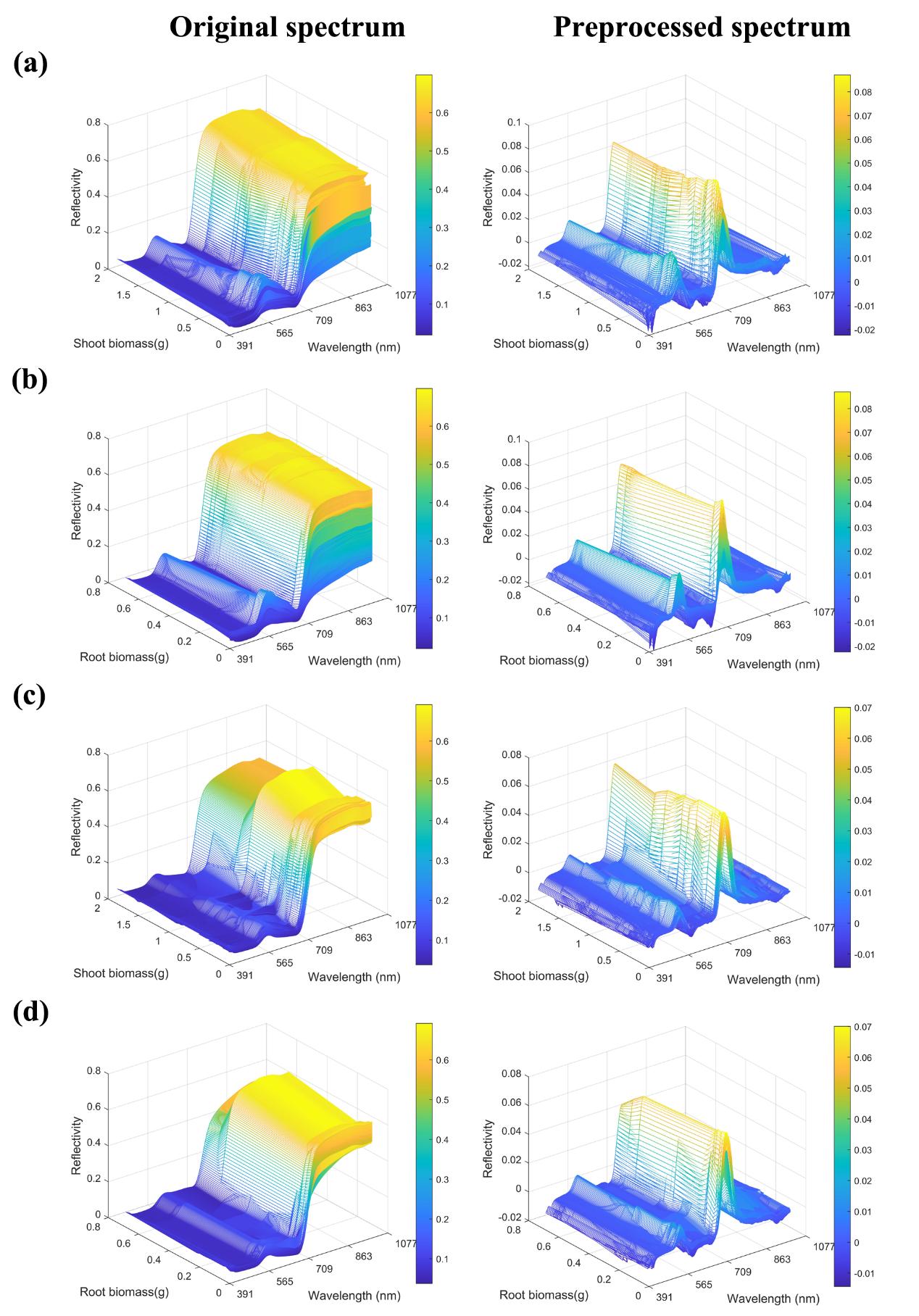 为了去除原始光谱数据的基线漂移、噪声等信息,建立稳定、可靠的定量分析模型,我们结合S-G、MSC和1-D对光谱数据进行预处理。原始平均反射率光谱图和预处理后光谱曲线如图2所示。预处理后,可以清晰地观察到光谱的吸收峰和反射谷更加突出,提高了光谱的灵敏度。