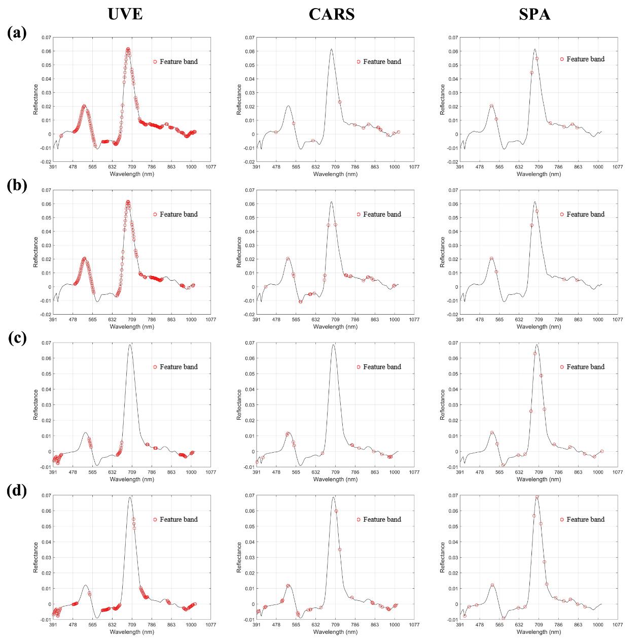 为了消除无关波段对模型精度的影响,我们使用UVE和SPA算法选择特征波段,如图3所示。