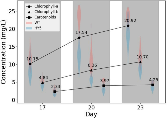 本研究共采集了432株幼苗,其中一半为野生型,一半为HY5型。幼苗叶片中色素浓度随时间的平均值和分布如图2所示。这些折现说明了每种光合色素的平均浓度总体上呈上升趋势。叶绿素浓度在第20天显著高于第17天,第23天变化不大。这可能有两个潜在原因:随着植物的生长,它可能耗尽了土壤中可用的营养物质。光合色素,如叶绿素,需要氮、镁等关键营养物;植物可能将资源转向开花、结果或其他繁殖过程。小提琴图展示了不同时间间隔中色素浓度的分布,小提琴图中较宽的部分表明该范围内样本数量较多。每个时间点分组的上部小提琴图显示了野生型的分布,而下部小提琴图代表HY5突变型。HY5是植物生长发育过程中促进光形态发生,刺激叶绿素和类胡萝卜素合成的关键调控因子。HY5缺失导致下胚轴变长,光形态发生受损导致色素沉着减少。