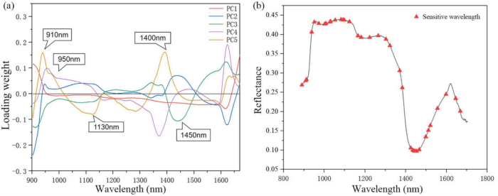 在主成分分析法中,载荷图通常用来检验特征与主成分之间的关系,每个主成分中原始变量的权重有助于进一步理解所选波长的重要性。如图4(a)所示,在21个选定的主成分中,有5个主成分占总载荷的90%以上。曲线的峰谷分别出现在910 nm、950 nm、1130 nm、1400 nm和1450 nm附近,与番茄幼苗色素的相关性*强。PC4在910 nm左右上升,PC5在1130 nm左右下降,可能是由于C-H键的拉伸和弯曲振动引起的。950 nm和1130 nm附近发生的特征是由于对称和不对称振动和旋转方式对H2O分子的吸收。1450 nm左右的显著下降与水的O-H拉伸*一泛音和碳水化合物的存在有关。