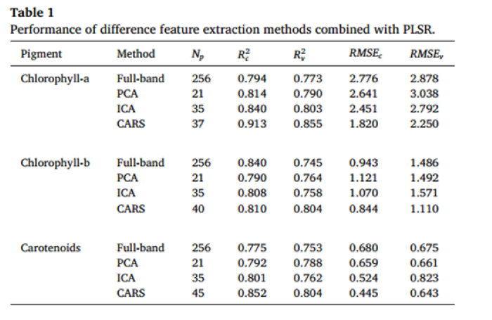 为了证明特征提取有助于预测性能的提升,进行了全波段对比实验。表1显示了不同特征提取方法与PLSR结合时的性能,其中Np代表预测中使用的特征数量,R2c、R2v和RMSEc、RMSEv分别代表校准集和验证集上的R2和RMSE值。如表1所示,通过整合三种特征提取方法,PLSR模型的性能较使用全波段特征有所提升。以叶绿素-a为例,与全波段相比,PCA、ICA和CARS组合的R2分别提高了0.027、0.030和0.082。此外,其他三种色素的预测中也发现了相同的改善。因此,这些特征提取方法能有效地移除反射光谱中的无关信息。