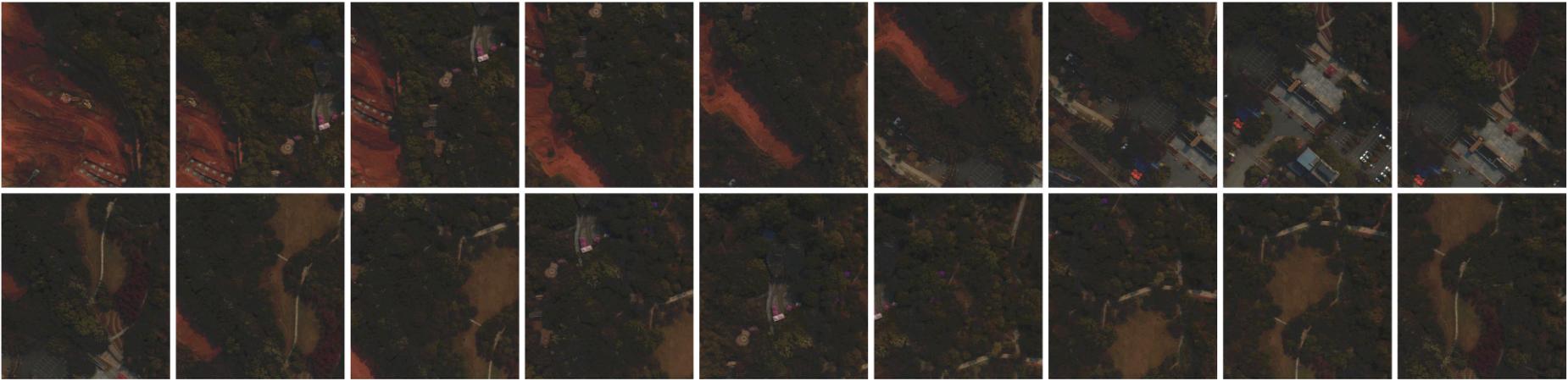 本文所进行实验的数据集为无人机拍摄的真实高光谱数据,拍摄场景为四川省某植物园,拍摄高度为300米,相邻图像具有较大的重叠区域,单张图像空间分辨率为960×1057,光谱范围覆盖400-1100nm,每隔4nm获取一幅单波段灰度图像,共176个波段。该数据集包含有丰富的地物信息,包括树林、灌木丛、草地、道路、建筑物等,数据在拍摄过程中受到噪声影响,且相邻图像间具有一定视差,因此在该数据集上所进行的实验能反映本文方法在真实环境与应用中的有效性。所有实验均在2.8GHZ英特尔酷睿i7-7700HQ的CPU和8GB内存的电脑上测试,方法以Matlab代码实现。数据集中18幅高光谱源图像如图1所示,为了便于观察,所展示的图像为数据集中第76波段(对应波长700nm)、第38波段(对应波长548nm)及第13波段(对应波长448nm)三个波段所融合而成的伪彩色图像形式。