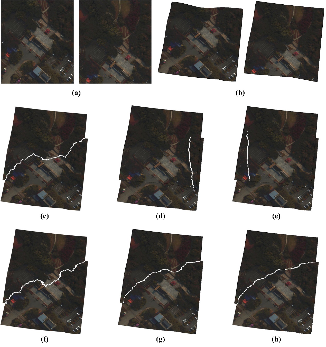图3 本文提出方法与其它拼缝线检测方法的拼缝线质量比较。利用SSIM指数对所有探测到的拼缝线进行了定量对比。为了便于观察,图像同样以伪彩色形式展示。(a)输入两幅高光谱源图像;(b)配准图像;(c)Seam-driven,SSIM = 0.9098;(d)DP,SSIM = 0.8887;(e)EDP,SSIM = 0.8717;(f)Farse,SSIM = 0.9195;(g)5/2 normed,SSIM = 0.9203;(h)本章方法,SSIM = 0.9371。