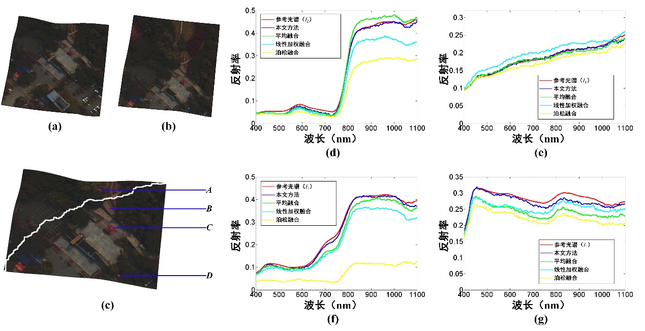 图4 本文方法与三个传统融合方法的光谱信息一致性对比结果。(a)、(b)两幅已配准的源图像;(c)配准图像重叠区域及所得到的拼缝线,点“A”、“B”、“C”、“D”分别为图中四个典型地物“树木”、“道路”、“建筑物”以及“白色轿车”所对应的像素;(d)“树木”光谱曲线结果;(e)“道路”光谱曲线结果;(f)“建筑物”光谱曲线结果;(g)“白色轿车”光谱曲线结果。