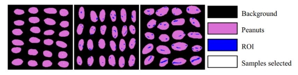 对于健康的花生样本,我们从每种花生的训练图像中随机选取了100个像素。对于发霉的花生,首先从训练图像中手动选择发霉的像素作为感兴趣区域(ROI);然后,从每种花生的ROI中随机选取50个像素。因此,共计获得了600个花生像素样本,其中包括300个健康花生像素和300个不同程度真*感染的发霉花生像素。所选取的花生像素样本如图2所示。