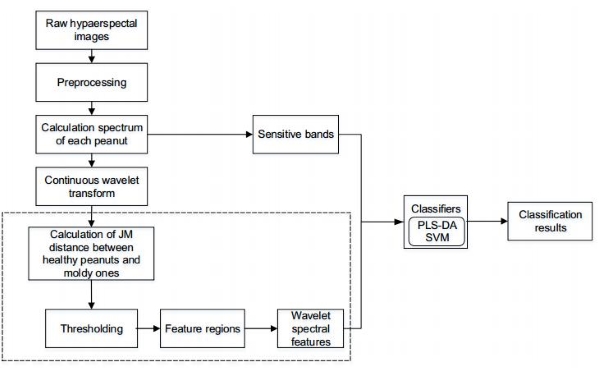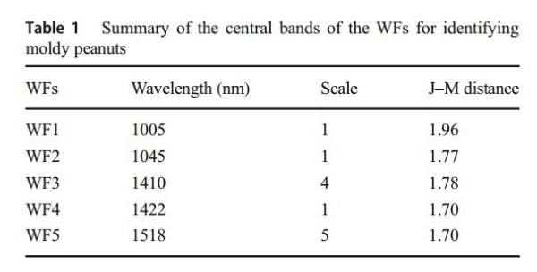 健康和霉变的花生在对短波红外光的光谱响应上表现出显著差异。在本研究中, CWT被应用于高光谱分类框架中,以提取特征来识别霉变花生。确定了五个WFs用于将花生分类为健康或霉变。本文展示的结果表明,WFs结合PLS-DA或SVM有希望识别出花生仁上的霉变——测试数据的准确度至少为96.19%。这比使用由SPA获得的*佳波段进行分类的性能更好。未来的研究应包括更多样化和不同种类的花生样本,建立霉变严重程度评估方法,对不同霉菌的霉变花生进行分类,并建立更可靠的阈值确定方法。这些改进可以增强所选WFs的鲁棒性。