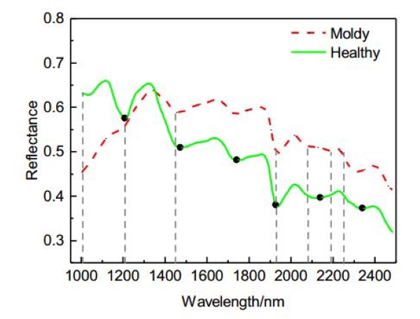 图4展示了健康和霉变花生的反射光谱,这些光谱是通过计算不同类别样本光谱的平均值得出的。在健康花生的反射光谱中可以看到六个显著的吸收峰,分别位于大约1208纳米、1472纳米、1747纳米、1938纳米、2145纳米和2329纳米(用黑点标记),主要可以归因于与花生中的水分、蛋白质和油脂成分相关的CH、NH和OH的吸收。在1000-1500纳米的波长范围内,健康和霉变花生的光谱曲线形状明显不同。当花生*生霉变时,1118纳米处的反射率降低,导致吸收峰减弱。在1365-2486纳米的波长区域,霉变花生的反射值高于健康花生,这可能归因于真*污染引起的散射和吸收特性。真*的侵入可以使花生仁胚乳变得多孔,这可能导致霉变花生比健康花生散射更多的光线,这种散射会导致在反射模式下吸收更少的近红外辐射。