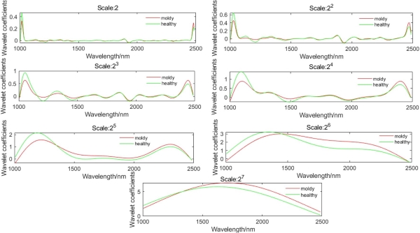 图5.不同尺度下健康与霉变花生平均光谱的小波系数