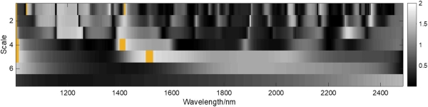 在不同波长和尺度下,计算了每个样本光谱的小波系数,图 5 展示了健康与霉变花生样本的平均光谱结果。随后,通过计算不同类别小波系数之间的 J-M 距离,生成了一张指示WFs光谱敏感性和区分能力的尺度图(图 6)。在本研究中,顶部 1% 元素的阈值 J-M 值为 1.70,基于该阈值筛选出五个对霉变花生高度敏感的小波特征区域(图 6 中的橙色区域)。如图 6 所示,这些敏感特征区域主要集中在 1000–1500 纳米的波长范围内。该波长区域的光谱曲线形状在健康与霉变花生之间表现出显著差异(图 4)。在每个特征区域中,选取 J-M 距离*大的点,最终选择了五个用于区分霉变与健康花生的小波特征。它们的具体波长和尺度见表 1 。