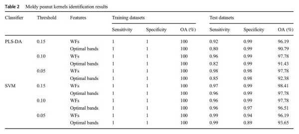 在此,我们使用了一个阈值来确定花生仁是否霉变。理论上,较小的阈值更好,因为它可以避免将霉变的花生误判为健康的花生。相反,较小的阈值可能会增加将健康花生仁误判为霉变的风险,这可能会导致因错误丢弃而造成的经济损失。因此,确定阈值至关重要。考虑到使用0.05、0.1和0.15的不同分类器的整体分类结果,本文推荐使用0.1作为折中的阈值。但是,未来应该探索一种可靠的阈值确定方法。此外,尽管本研究表明,通过结合CWT和高光谱成像技术,有可能以相对较高的准确度识别霉变花生,但本研究得到的特征和模型可能仍不适合实际应用于多样化的花生。不过,本研究中描述的特征提取和建模方法可以作为开发核心算法的参考。
