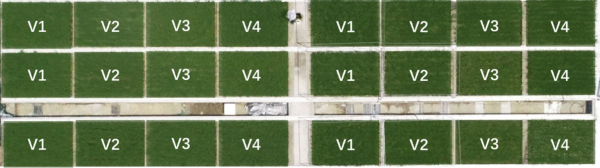 图1.2019年和2020年试验小区的实验区域地图,分别展示了2019年四个品种(V1: 武运粳23号,V2: 武运粳24号,V3: 武运粳7号,V4: 南粳44号)和2020年另外四个品种(V1: 扬农1号,V2: 南粳9108号,V3: 南粳5055号,V4: 淮稻5号)的试验小区布局