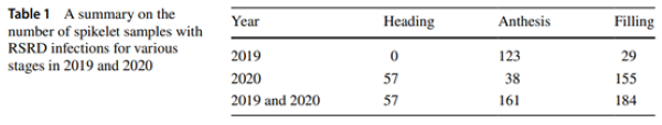 由于丰满紧凑的粳稻品种更易感染RSRD,我们选择了江苏省常见的八个粳稻品种进行实验(2019年:武运粳23号、武运粳24号、武运粳7号和南粳44号;2020年:扬农1号、南粳9108号、南粳5055号和淮稻5号)。在2019年和2020年的实验小区中,RSRD自然发生。