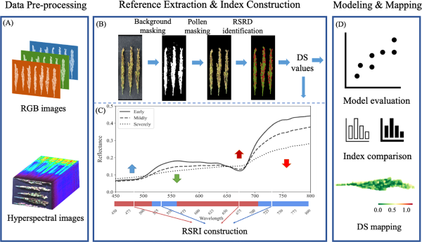 在本研究中,高光谱成像技术(HSI)主要应用于水稻穗腐病(RSRD)的精准监测与病害严重程度量化。通过结合近距离高光谱成像与化学计量学分析,HSI不仅能够捕获水稻穗粒的光谱特征,还能够提供空间信息,从而实现对病斑的识别和分布可视化。该技术可用于水稻生长的不同阶段,克服了传统病害监测方法在时间和空间上的局限性,使病害检测更加稳定和准确。研究中构建的水稻穗腐病指数(RSRI),能够在多个生长阶段保持良好的监测性能,并为病害的早期预警提供科学依据。此外,高光谱成像技术还能应用于病害传播动态监测、作物育种筛选以及精准农业管理,为提高粮食安全与作物健康提供强有力的技术支持。