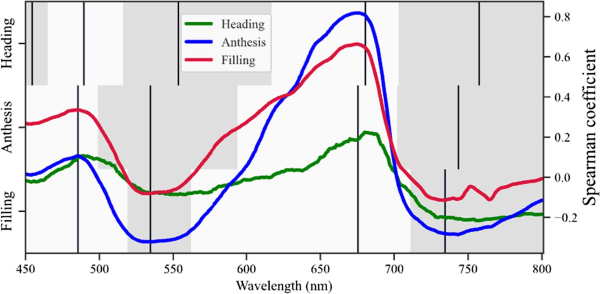 图4.不同生长阶段(绿色:抽穗,蓝色:开花,红色:灌浆)下疾病DS与450至800nm波长处反射率之间的Spearman相关系数。灰色和白色背景分别代表负相关和正相关。黑色垂直线对应于灰色或白色相关域中的*大系数(上排:抽穗,中排:开花,下排:灌浆)