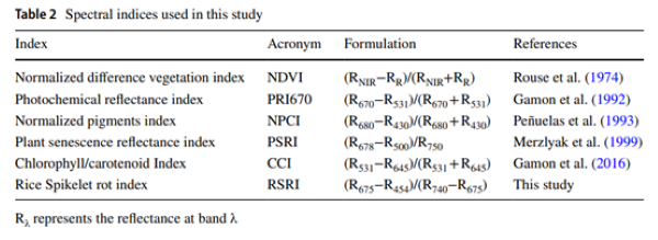 蓝色波段在疾病监测中的贡献:蓝色波段在疾病监测中的重要性得到了证实,因为只有RSRI和NPCI在抽穗阶段(感染的早期阶段)的DS量化中达到了可接受的准确性。蓝色区域的反射率特征是主要色素的吸收重叠。因此,蓝色反射率应对由病原体感染引起的微妙生化变化敏感。例如,蓝色光谱特征可以记录在早期应激阶段,衰老和不健康植物中常见的叶绿素含量的减少。此外,蓝色波段对稻穗成熟的不敏感性可能部分解释了RSRI在不同生长阶段对DS的一致敏感性(Figs. 7, 8)。